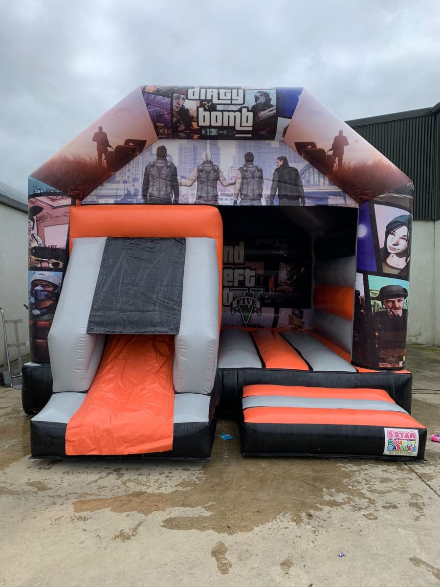 Our GTA slide bouncy castle is a thrilling inflatable play structure themed around the popular GTA video game. It features vibrant graphics and iconic elements from the game, such as characters. The bouncy castle includes a spacious bouncing area and an exciting slide, allowing kids to jump, climb, and slide in a safe and fun environment. Perfect for gaming-themed parties, community events, and festivals, the GTA slide bouncy castle offers an immersive and action-packed experience for young fans of the game.