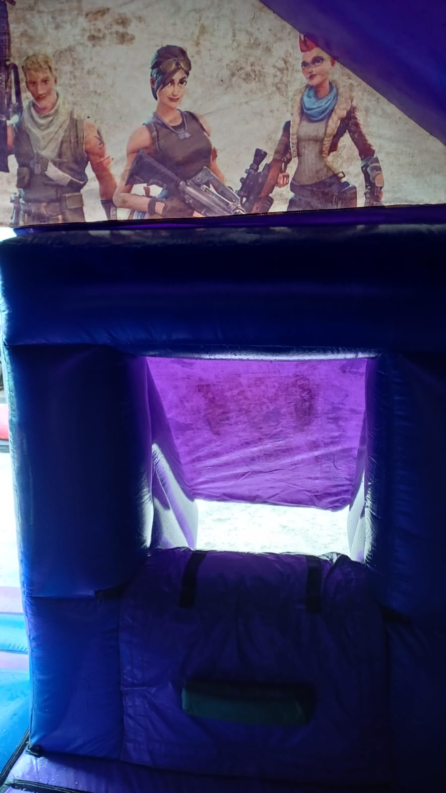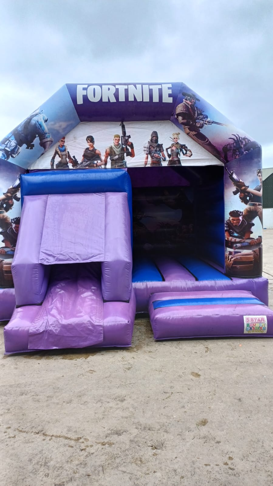 Our Fortnite slide bouncy castle is a thrilling inflatable play structure themed around the popular Fortnite video game. It features vibrant graphics and iconic elements from the game. The bouncy castle includes a spacious bouncing area and an exciting slide, allowing kids to jump, climb, and slide in a safe and fun environment. Perfect for gaming-themed parties, community events, and festivals, the Fortnite slide bouncy castle offers an immersive and action-packed experience for young fans of the game.