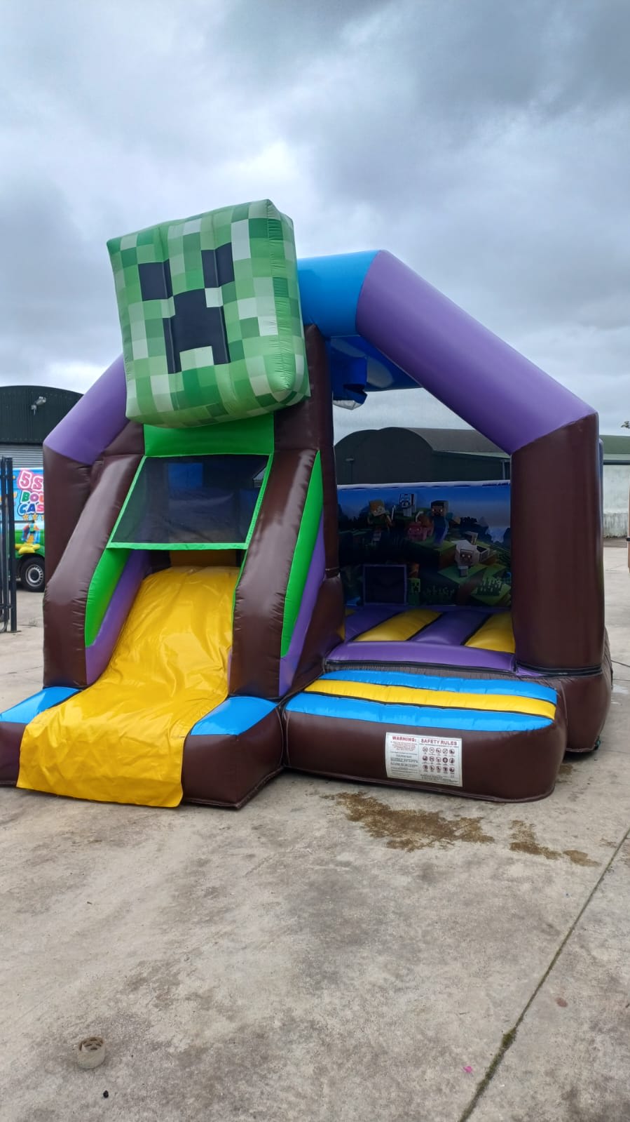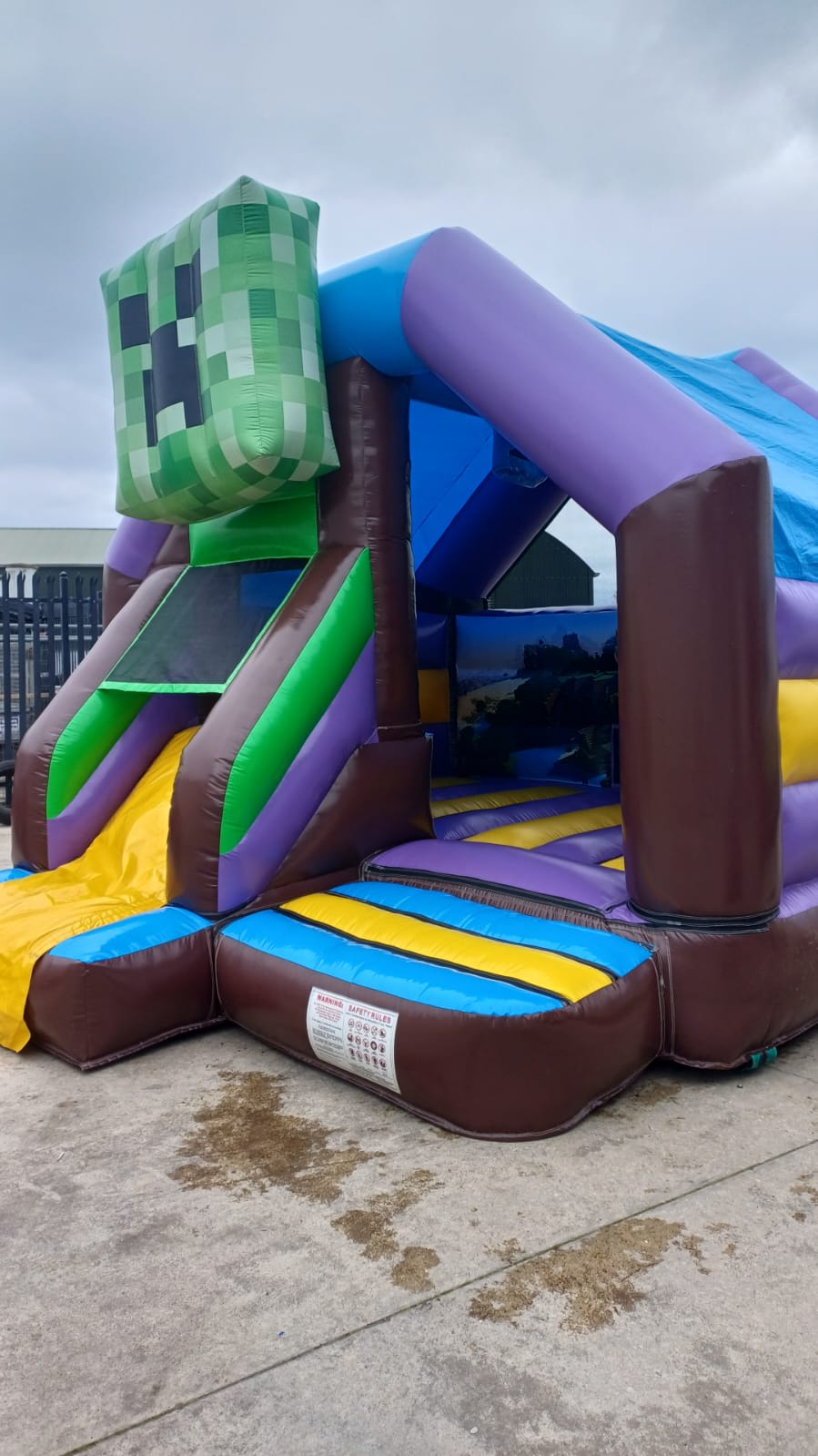Our Minecraft bouncy castle with a slide is an exciting inflatable play structure designed to capture the essence of the popular video game Minecraft. Featuring pixelated graphics and familiar in-game elements like characters, blocks, and landscapes, this bouncy castle provides an immersive experience for fans of all ages. The structure includes a spacious bouncing area and an integrated slide, allowing kids to jump, explore, and slide in a safe and fun environment. Perfect for gaming-themed parties, community events, and festivals, the Minecraft bouncy castle with slide brings the creative world of Minecraft to life in a thrilling and interactive way.