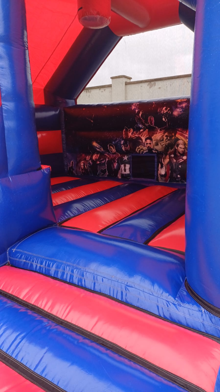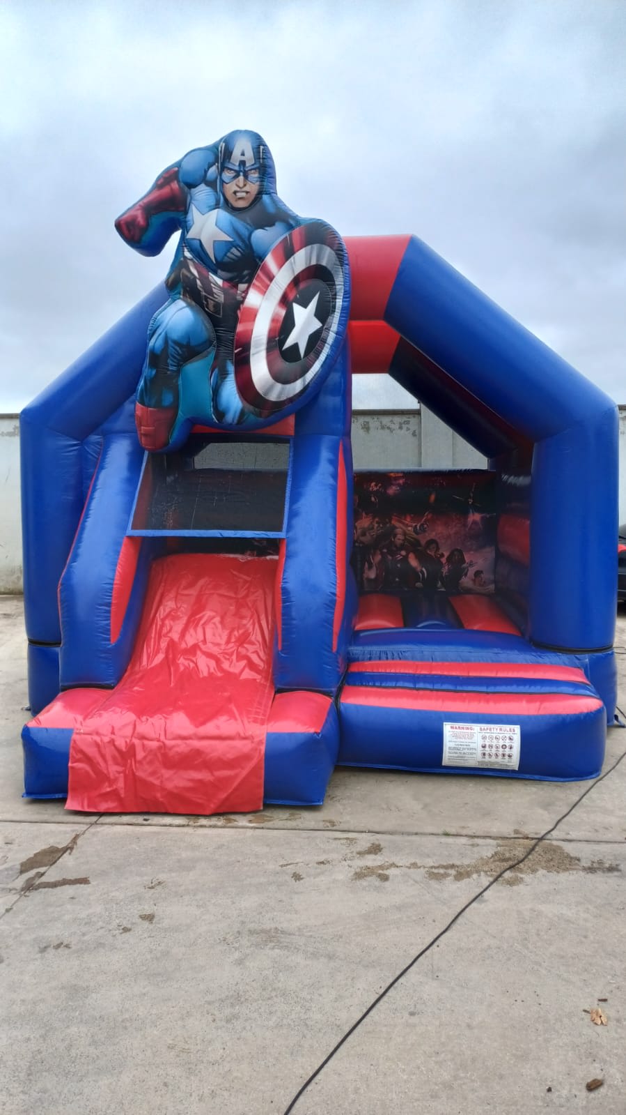 Our Captain America bouncy castle with a slide is a thrilling inflatable play structure themed around the iconic Marvel superhero. This bouncy castle features bold and colorful graphics of Captain America, including his famous shield creating an immersive superhero experience. It includes a spacious bouncing area where kids can jump and play, along with an integrated slide for added excitement. Perfect for superhero-themed parties, community events, and festivals, the Captain America bouncy castle with slide offers an adventurous and action-packed playtime for young fans of the beloved hero.