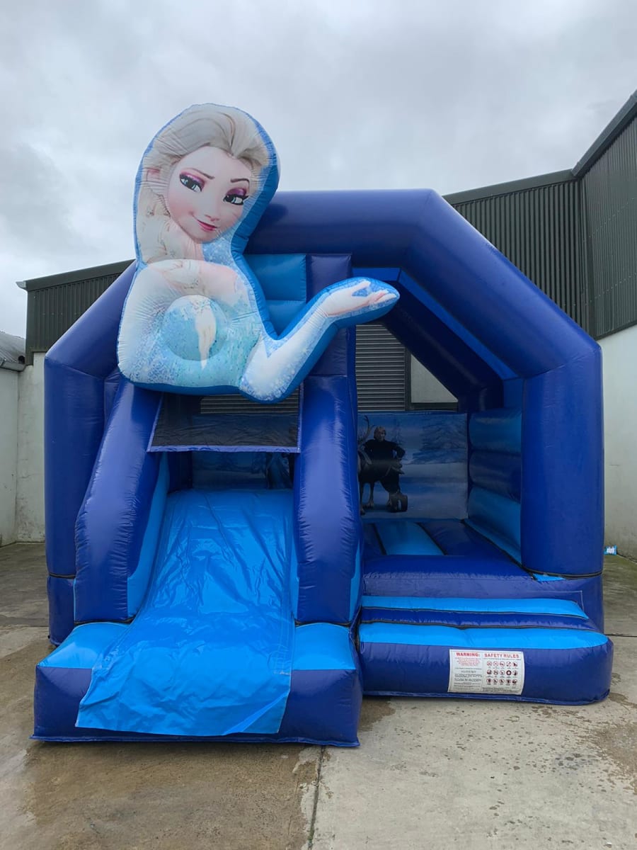 A Frozen castle bouncy castle with a 3D Elsa, pictures of other characters inside, and a slide is a magical inflatable play structure inspired by the beloved Disney movie "Frozen." This enchanting bouncy castle features cool icy colours. The highlight is a stunning three-dimensional figure of Elsa, adding a captivating and majestic touch to the castle. Inside, children can bounce and play in a spacious area adorned with images of other favourite characters like Anna, Olaf, Kristoff, and Sven. An integrated slide adds an extra element of excitement. Perfect for Frozen-themed parties, community events, and festivals, this Frozen castle bouncy castle offers a whimsical and immersive experience for young fans of Elsa and her friends.