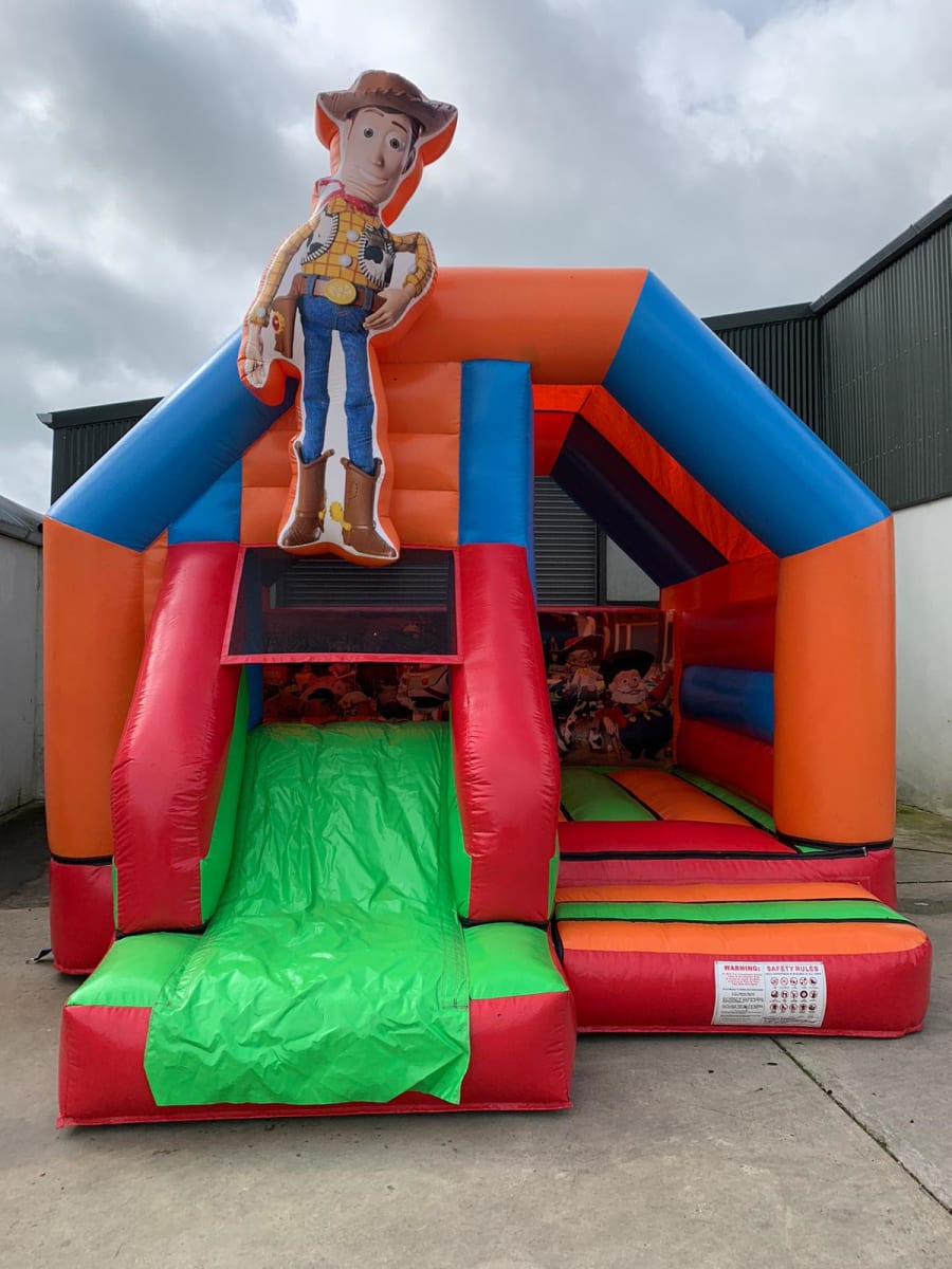 Our Toy Story-themed bouncy castle is an enchanting inflatable play area designed to bring the beloved world of Toy Story to life. It features a prominent 3D character figure of Woody, standing tall and welcoming children to join the fun. The back wall of the bouncy castle is adorned with vibrant images of other iconic characters like Buzz Lightyear, Jessie, and Rex, creating an immersive Toy Story experience. This bouncy castle is made from durable, safety-certified materials and includes an open bounce area where kids can jump and play, with a slide to add to the excitement. Perfect for birthday parties, themed events, and celebrations, this bouncy castle offers endless joy and excitement for young fans of the Toy Story series.