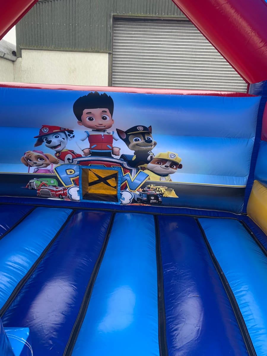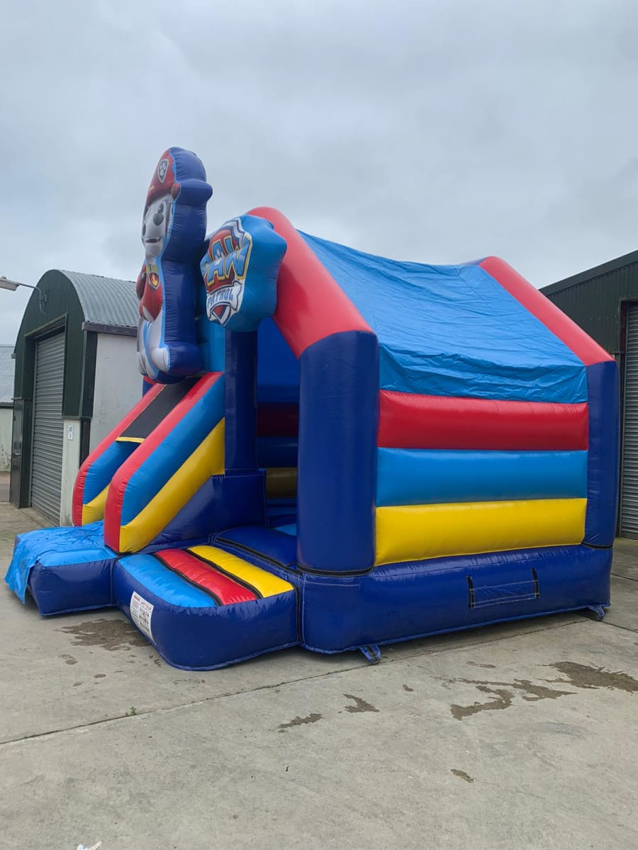 Our Paw Patrol-themed bouncy castle is an exciting inflatable play structure perfect for young fans of the popular animated series. It features a large 3D figure of Marshall, the beloved fire pup, standing prominently to greet children as they enter. The walls of the bouncy castle are decorated with vibrant images of other favourite Paw Patrol characters such as Chase, Skye, and Rubble, adding to the immersive experience. The castle also includes an exhilarating slide for added fun, ensuring endless entertainment. Made from durable, safety-certified materials, this bouncy castle is ideal for birthday parties, themed events, and any celebration, providing a safe and joyful environment for kids to bounce, play, and slide.