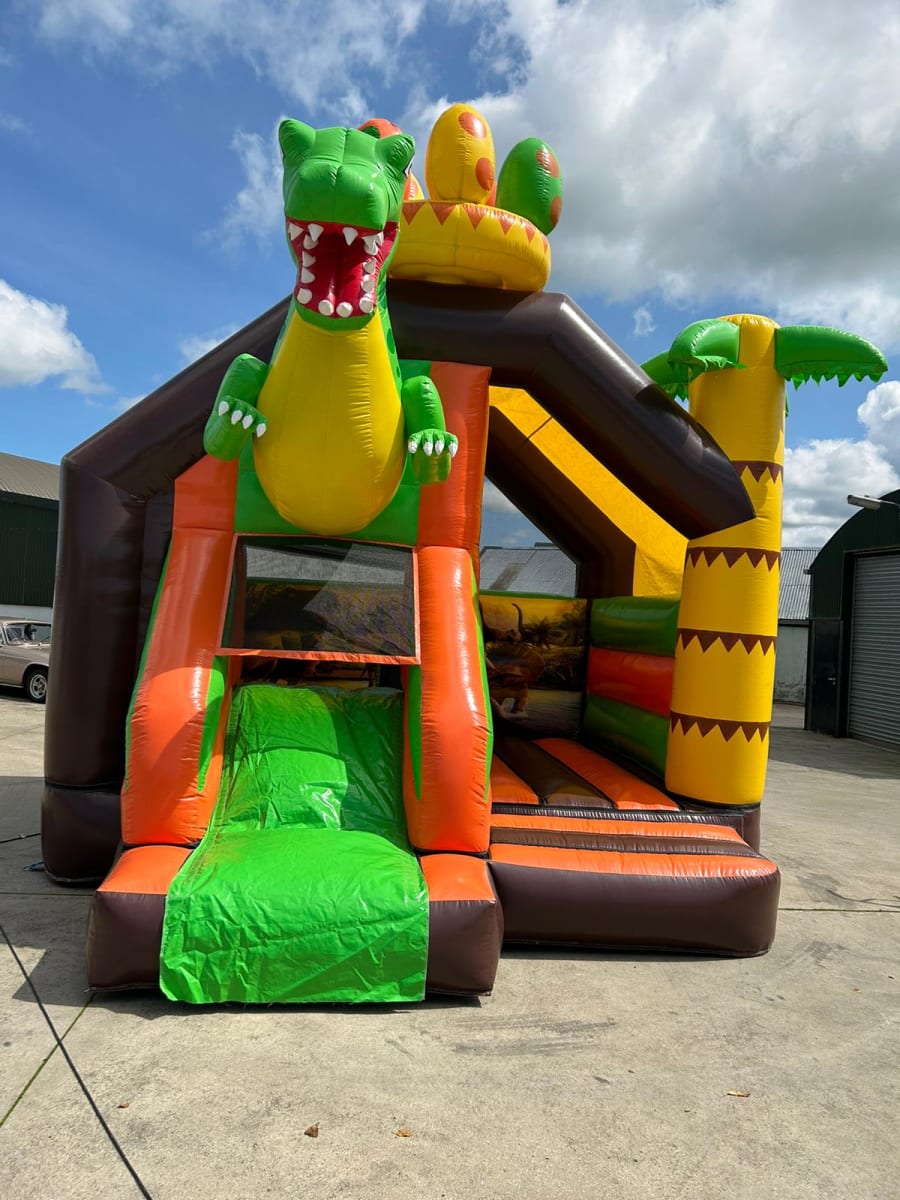 The Dinosaur Bouncy Castle with Slide is an exciting inflatable play structure perfect for young dinosaur enthusiasts. It features a spacious bouncing area and an integrated slide, all decorated with vibrant dinosaur images and a 3D inflatable dinosaur figure. The design includes detailed illustrations of various dinosaurs and prehistoric landscapes, creating an immersive and thrilling experience for children. This bouncy castle is ideal for birthday parties, community events, and indoor play centres, offering a safe and entertaining activity that captures the imagination and energy of young adventurers.