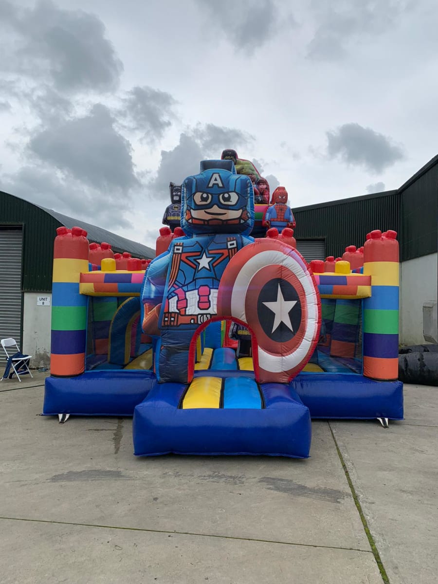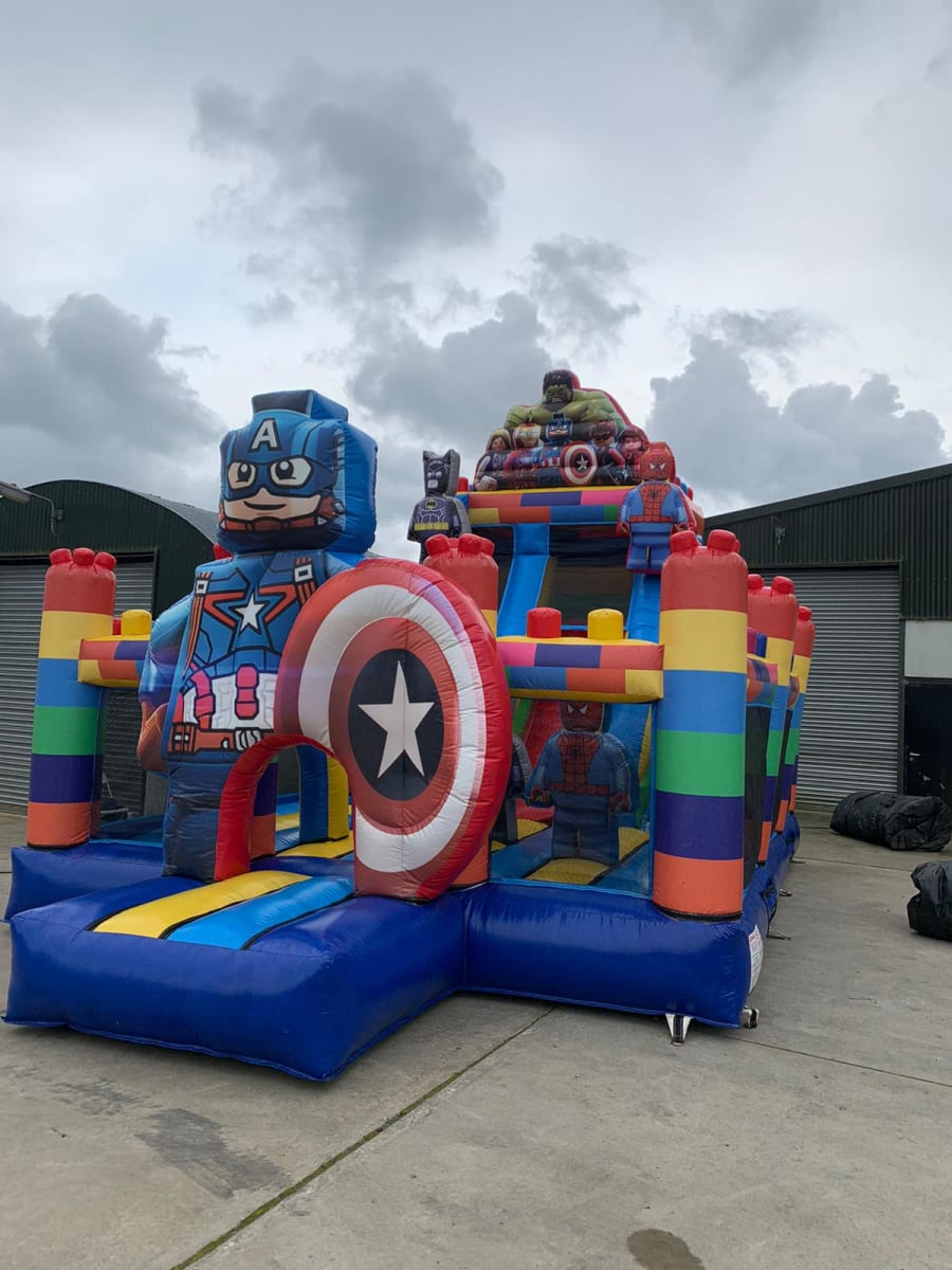 Our Legoland-themed bouncy castle features vibrant, Lego-inspired designs with life-sized inflatable 3D figures of popular Lego characters. It includes a large, exciting slide which leads to a soft, bouncy landing area. Inside, children can navigate through interactive inflatable pillars, arches and 3D characters. This durable and safety-certified attraction offers endless fun and imaginative play, perfect for events and parties.