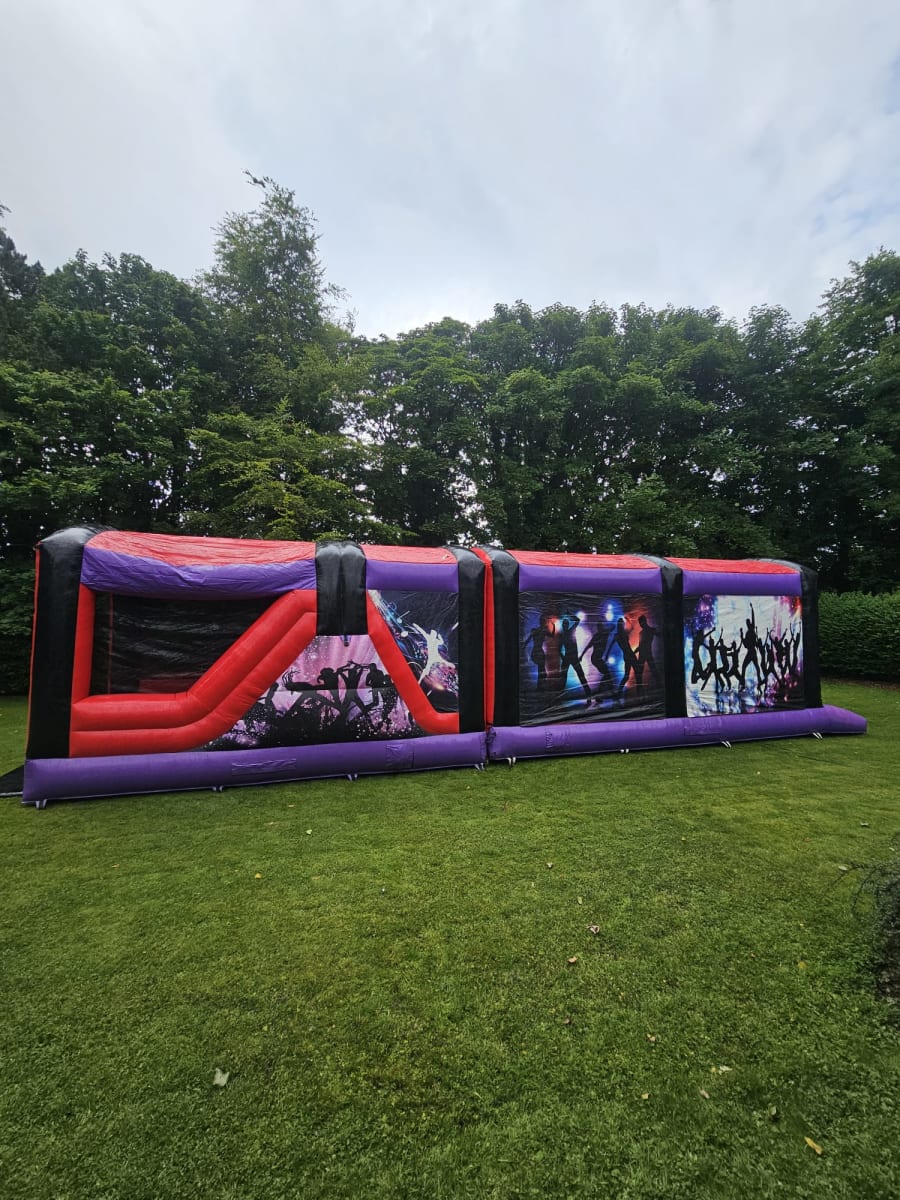 Picture a thrilling 40-foot covered obstacle in Derry City featuring blow-up pillars, a challenging climbing wall, and an exhilarating big slide. The course is designed for adventure seekers of all ages, offering a series of exciting obstacles to conquer. Participants navigate through inflatable pillars, test their climbing skills on a sturdy wall, and cap off the adventure with a thrilling descent down a spacious slide. It's an action-packed experience that promises fun, excitement, and a memorable challenge for everyone involved.