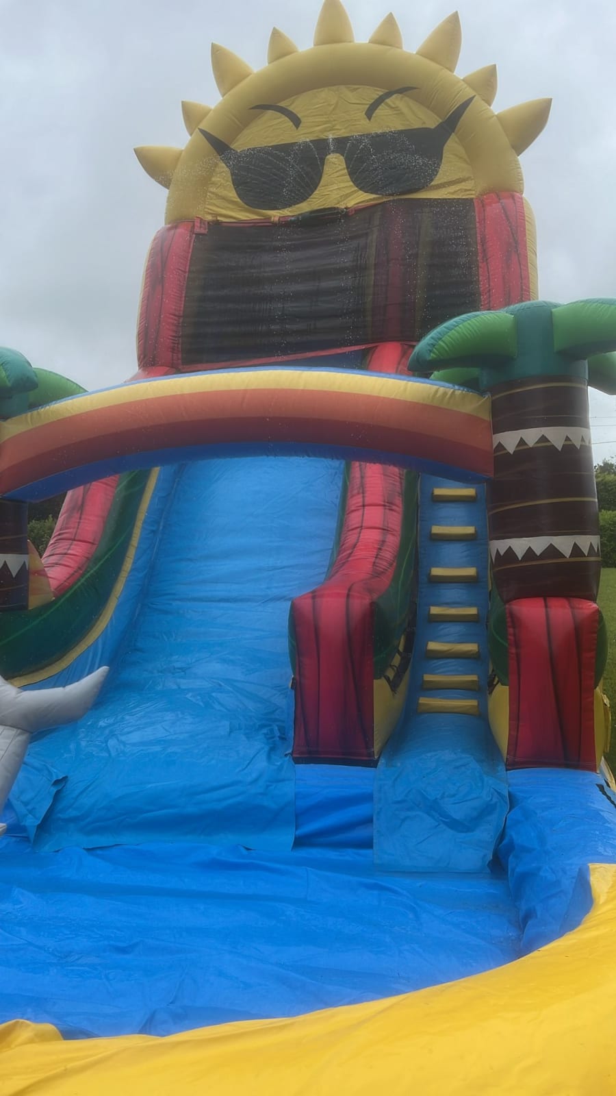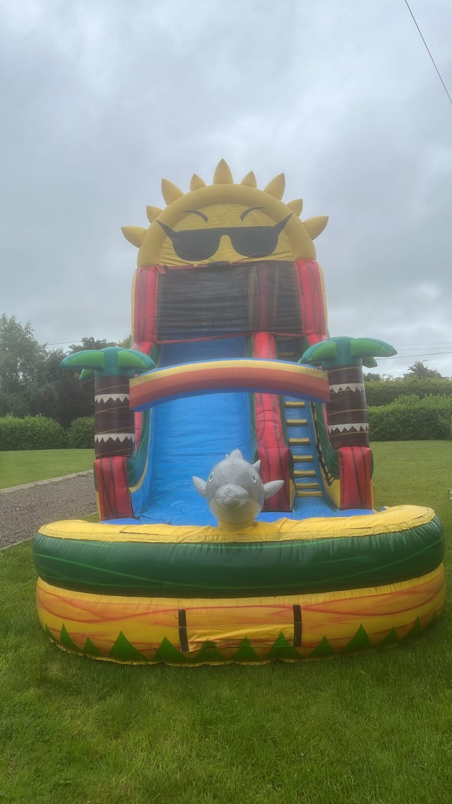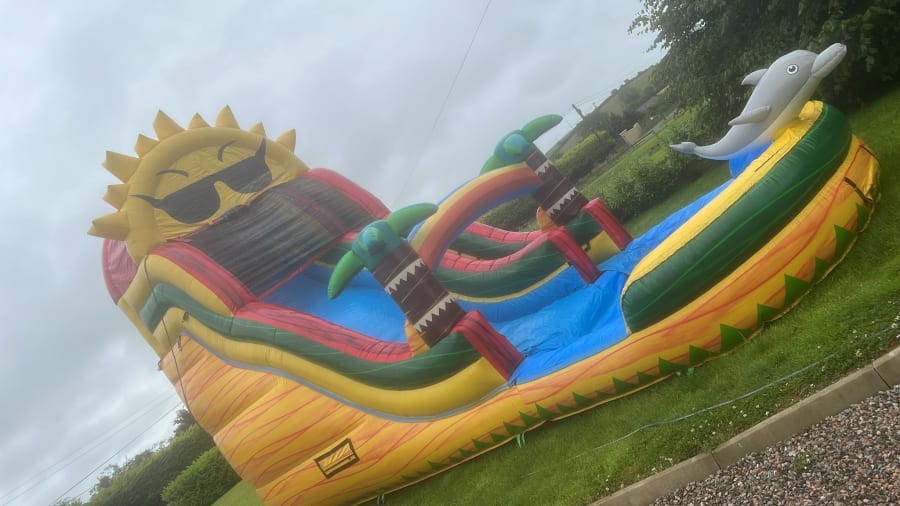 A dynamic waterslide featuring engaging 3D elements, including a lifelike dolphin sculpture that adds a playful touch. The slide offers an exhilarating ride, complemented by vibrant, ocean-themed graphics and palm trees. The dolphin sculpture, prominently positioned, enhances the immersive aquatic experience. This waterslide ensures both fun and safety while delivering a splashy adventure.