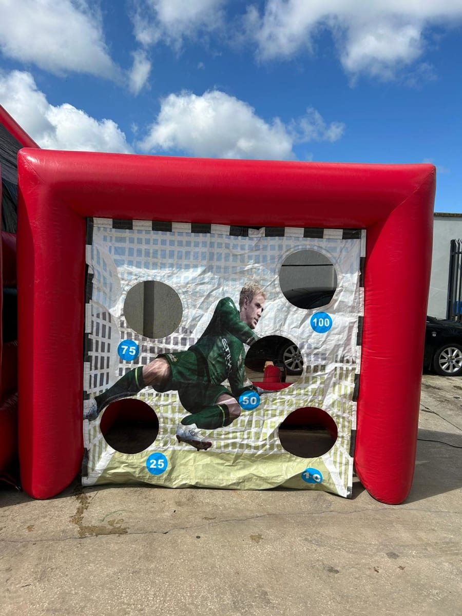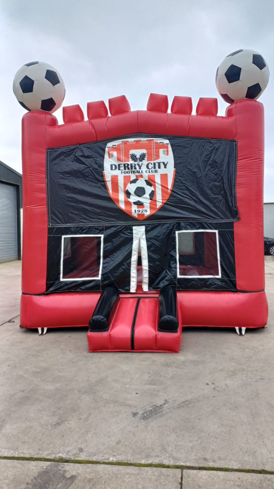 Imagine a bouncy castle celebrating Derry City with its vibrant colours and 3D footballs perched at the top corners. The castle itself is adorned with the club's emblem and colours, creating a spirited atmosphere for children to enjoy. It's a playful homage to the team, combining fun and fandom in a bouncing adventure.